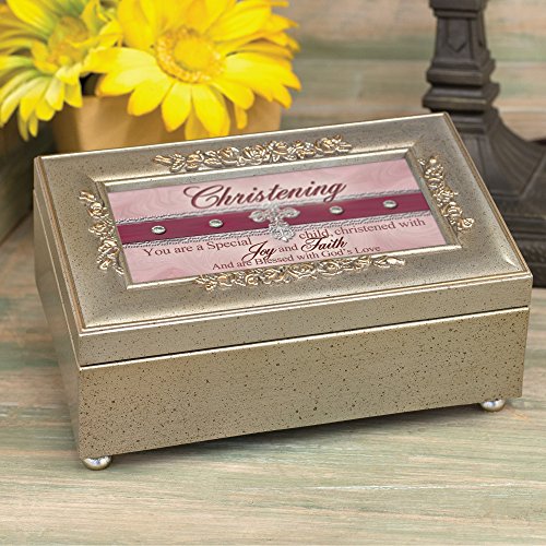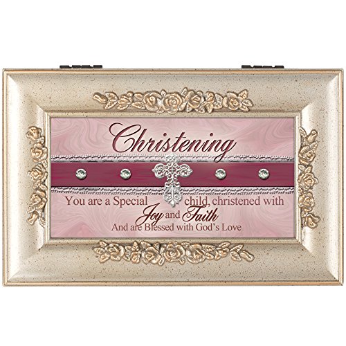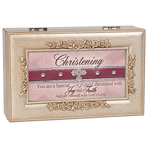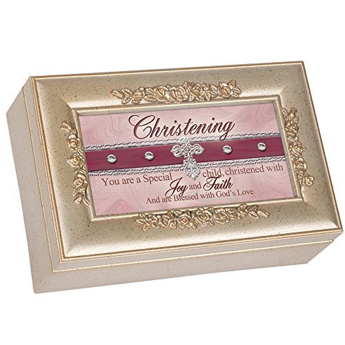 Christening Pink Ribbon Cross Speckled Silver Petite Rose Jewelry Music Box Plays Amazing Grace