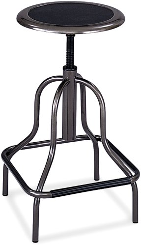 -. Feature : Tall steel stool with back and screw-lift seatRed steel frame with clear-coat pewter finish / Nylon-coated screw-lift for manual height adjustment / Steel seat and chair back with leather padding / Foot rest and non-marring plastic plugs on end of feet / No assembly required