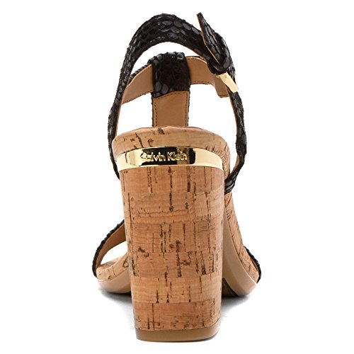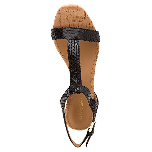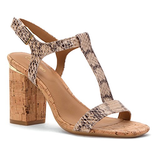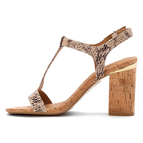 Open-toe sandal with T-strap featuring buckle closure at ankle and chunky heel