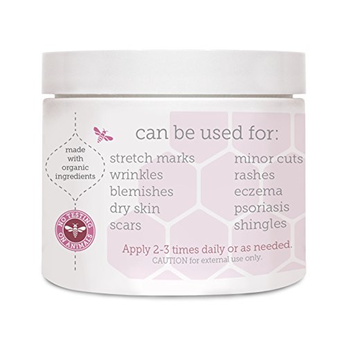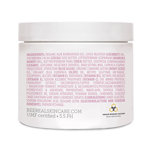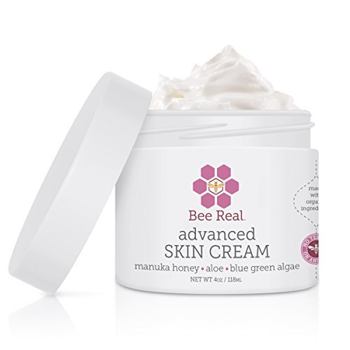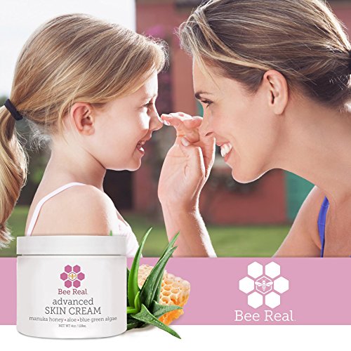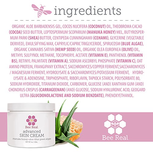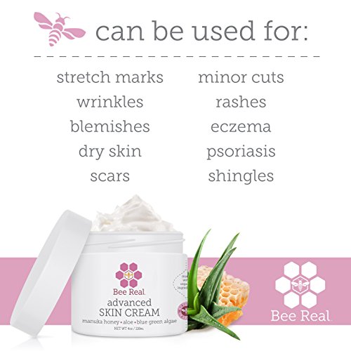 Bee Real Advanced Skin Cream uses Organic Medical Grade UMF Certified Raw Manuka Honey from New Zealand, Organic Aloe, Coconut Oil, Blue-Green Algae, Shea Butter, Hemp Seed, Olive Oil and Vitamins A, C, E & B5. This perfectly concocted advanced skin cream is pure magic! It is a GREAT preventative stretch mark cream, under-eye wrinkles treatment, and works wonders for dry & itchy skin! BEST face cream for Rosacea, Blemishes, Eczema, Guttate Psoriasis, a Shingles Rescue and Rashes!