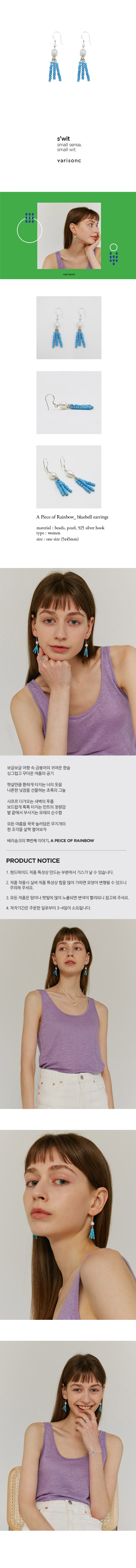 | bluebell earrings 영롱하게 울리는 종소리가 날 것만 같은 푸른꽃의 bluebell earrings [A/S 안내] - 14일 이내의 끊어짐 등 제품 불량에 대해서는 varisonc가 왕복 택배비를 부담하여 교환해드립니다. - 14일 이후의 끊어짐에 대해서는 고객님께서 왕복 택배비(6천원)을 부담하시면 1:1로 무상 맞교환해드립니다. - 구매일 이후 3개월 동안 제품 하자의 경우 무상 A/S 해드리며 추가의 재료가 필요한 경우에는 수선비가 발생할 수 있습니다. - 단, 소재 특성 상 제품 하자가 아닌 고객 부주의로 인한 경우에는 A/S가 어려울 수 있으니 양해 부탁드립니다. - 수선 제품 왕복배송비는 고객 부담입니다. [교환 및 배송 안내] - 제작기간은 주문일로부터 3~4일이 소요됩니다. (영업일 기준) - 베리송크의 모든 제품은 주문제작상품으로 교환 및 환불이 어려우니 신중한 구매 부탁드립니다. - 제품 하자 시에는 동일한 제품으로 교환 가능하며, 받으신 포장상태 그대로 반송 부탁드립니다. |