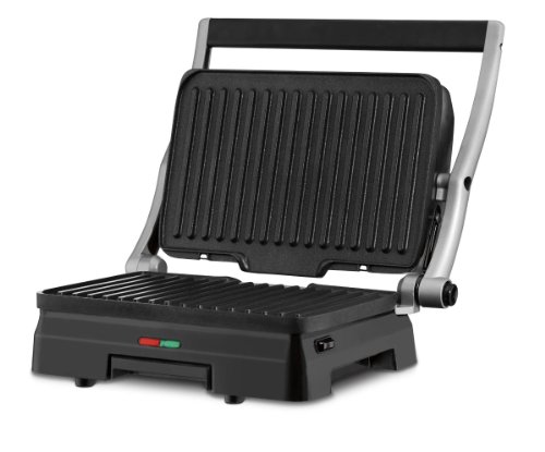 - Feature : Opens flat to double the cooking surface / Preset temperature is perfect for grilling burgers, steaks and sandwiches / Power On/Ready to Cook indicator lights / Adjustable front feet for better grease drainage / Brushed stainless steel housing; Dishwasher-safe plates
