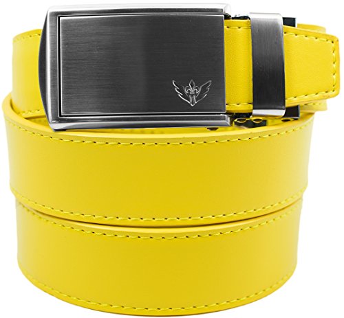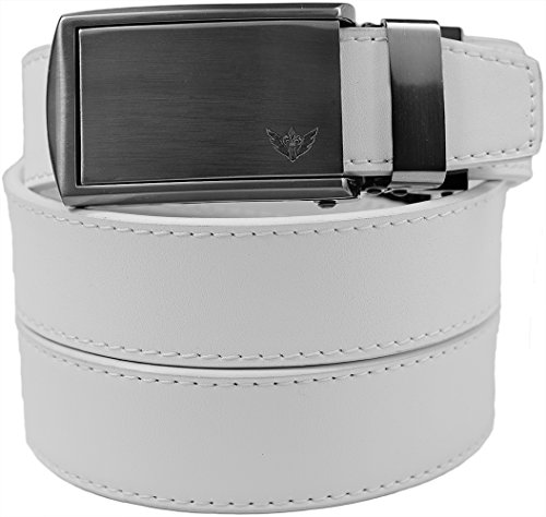 - Feature : Leather ratchet belts without holes provide over 30 unique adjustments for a perfect fit. / Trim-to-fit. Fits up to a 48" waist size. Easy to customize to your size and super-comfortable to wear. / Smooth dual-lever release system is simple to use and makes adjusting your belt effortless. / Straps are 1-1/4" (3.2 cm) wide. / Buckles are 1-5/8" (4 cm) wide x 3-1/2" (9 cm) long.