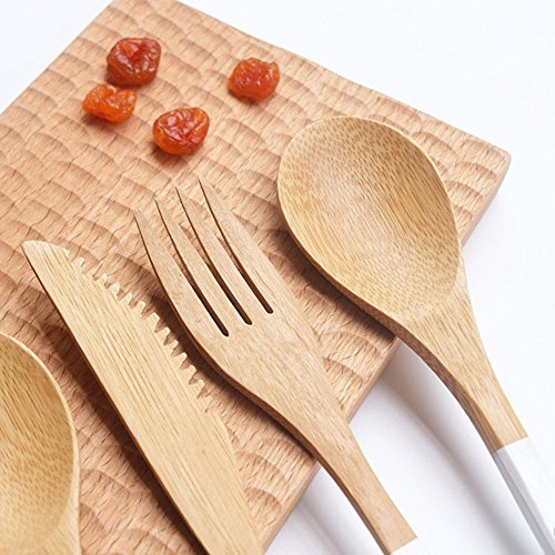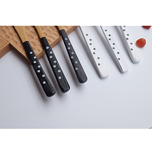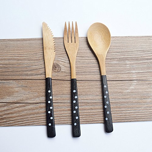 BooWoo 3 Pieces Bamboo Spoon Set; Wooden Kitchen Utensils with Polka Dot Handles; including Serving Fork,Mini Dinner Knife and Serving Spoon Black Handle with White Dots For Dessert Picnic