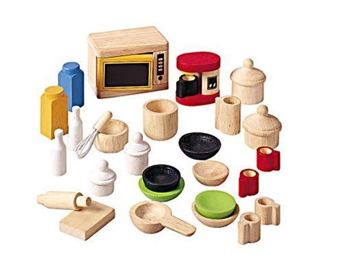 -. Feature : This set has 28 assorted kitchen utensils, appliances, and tableware. / This set has everything needed to furnish a dollhouse kitchen and dining room. / Durable construction and strong materials ensures that this toy will stand up to years of play. / This set is made from recycled rubber wood and coated with a non-toxic finish. All colors are made from vegetable dye.