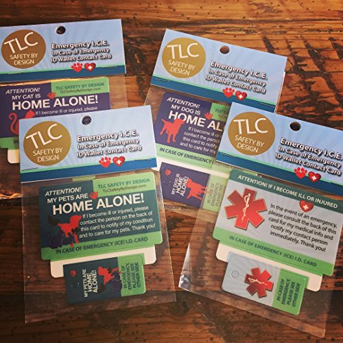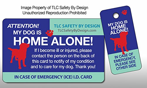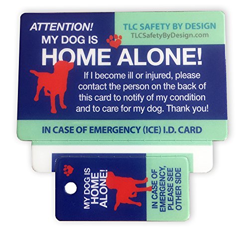 Studio : TLC Safety By Design Publisher : TLC Safety By Design Binding : Misc. Product Description What happens to your pets if something happens to you? Do you ever worry about what would happen if you ever got in an accident and couldn't communicate that your beloved pets are home alone? Based on feedback from friends and clients, TLC Pet Products has developed this glossy plastic credit card stock ""Home Alone" pet emergency ID wallet card and key tagthat fits easily in your wallet or phone pouch and place on your key ring, with room to write your contact person's details that will alert emergency personnel to contact your ICE person regarding your predicament and that your much loved pets are home alone. These are definitely vital cards to have in your wallet and on your keychain. - ENSURE YOUR PETS' PROTECTION SAFETY: If you are in a situation where you are hurt and can't speak, this card will do the talking for you.