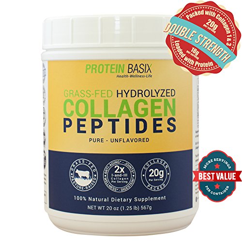 -. Feature : DOUBLE STRENGTH COLLAGEN BOOSTER - Each serving of our collagen powder contains DOUBLE the amount of Collagen Types 1 & 3 (20g) and protein (18g) found in many other collagen protein powder brands. Hydrolyzed gelatin for Optimal Absorption* 1 scoop = 56 servings, 2 scoop (double strength) = 28 servings per container / ANTI-AGING - 20 grams of Hydrolyzed Collagen per serving. Our Collagen powder provides a natural source of essential amino acids necessary to promote skin rejuvenation, healthy hair and nails, and slow the effects of aging* / HEALTH AND WELLNESS - With a higher concentrations of collagen peptides and collagen proteins, Protein Basix grass fed collagen is designed to not only maintain, but boost Bone Health & Joint Support, help Seal Leaky Gut, Improve Circulation, and BOOST Immune Support* / CONSUME CONFIDENCE- Our collagen powder is derived from Grass Fed Pasture Raised cow gelatin. Natural and Pure, Non GMO, Gluten Free, and FREE OF: hormones, antibiotics, preservatives, artificial flavors and sweeteners. Made and tested in the USA by a Certified cGMP, FDA Registered Lab. 100% satisfaction Guaranteed* / EASILY DISSOLVES FOR OPTIMAL ABSORPTION - Collagen hydrolysate peptides powder is a Hassle-Free, Unflavored addition for any collagen drink or food. Goes best with Coffee, Smoothies, Protein Shakes, Juices, Soups, Broths, or Salad Dressing.