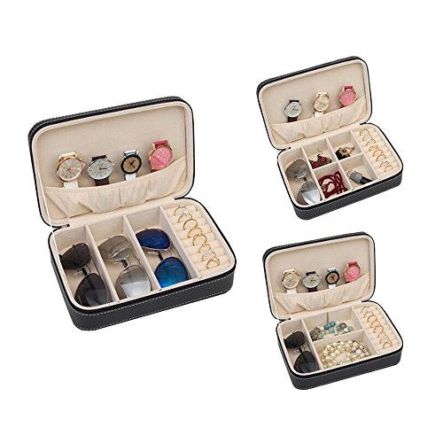 Multifunctional and DIY interior design, with removal divider inside and you could design your special jewelry organizer as you wish. You may keep 3 sunglasses with some rings; or you may set it for 1 sunglasses and 1 big component for large jewelries, either 4 small component for small jewelries; otherwise you may also remove all the dividers to make it big enough to store your necklaces or anything else