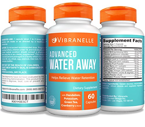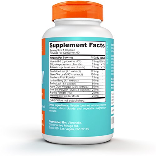 Vibranelle Advanced Water Away Natural Water Pill Diuretic, Dietary Supplement. Serving Size: 1 Capsule Amount Per Serving: Amount % Daily Value: Vitamin B-6 (pyridoxine HCl) _______25 mg ___1250% Potassium (as potassium chloride)____25 mg _____<1% Chloride (as potassium chloride) _____23 mg______<1% Dandelion Leaf (4:1 concentrate)____ 225 mg* Green Tea Leaf (50% extract)_______ 100 mg* Cranberry Fruit Powder ____________75 mg* Juniper Berry (4:1 extract) __________50 mg* Buchu Leaves (4:1 extract) __________ 50 mg* Apple Cider Vinegar (35% extract)____50 mg* Corn Silk Powder (styles stigmas) ___25 mg* Paprika Powder (fruit)______________ 25 mg* Watermelon Powder (fruit) __________25 mg* * Daily Value not established % Daily Value based on a 2,000 calorie diet. Other Ingredients: Gelatin (bovine), microcrystalline cellulose, silicon dioxide, and vegetable magnesium stearate.. 0
