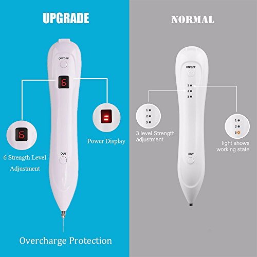 -. Feature : UPGRADE with display and 6 adjustable power outputs, suitable for different skin tolerance if you have moles ,freckles, tattoo, verruca vulgaris, granulation tissue and other pigmentation on skin epidermis, immediately make your skin smooth and clean / No Bleeding and feeling of electricity with the latest technology of microcomputer control, more steady and safer as home use facial beauty tool, battery level can be observed visually on LED Display if you quickly press the OUT button twice, keeping working over 5 hours on a charge / Usage: Cleaning the needle with alcohol, gently sweeps from back to front within a small area, it'll be better if you do a testing on apples or arms before first use. Do not stop in one place to avoid burning your dermis layer. Clean your eye spots in twice or more times carefully / Operations: Long-press ON/OFF button for 3s to start, press once to first mode and once to second mode. If you press to the sixth mode, press again and it'll be back to the first, the working mode can be showed on display. This device will keep working when you keep pressing OUT button, but it has power-off protection if you keep pressing it over 2 min once / Package includes: 1 spot eraser pen, 5 fine needles, 1 big needle, 1 USB cable and product manual ,including a safer and portable Yartar beauty solution