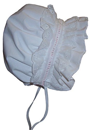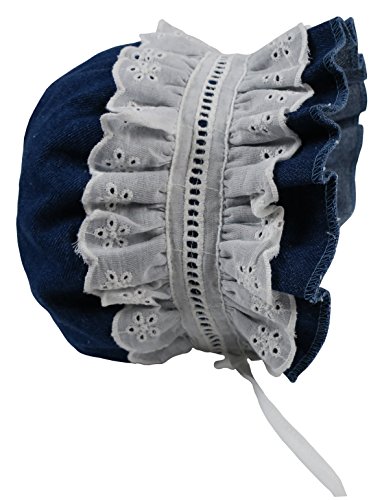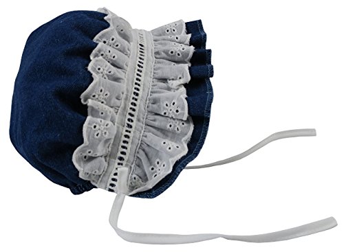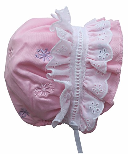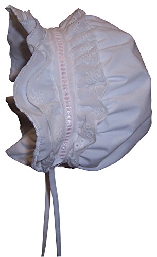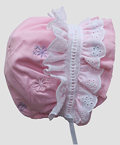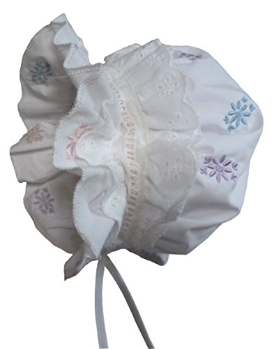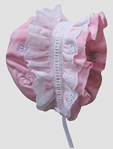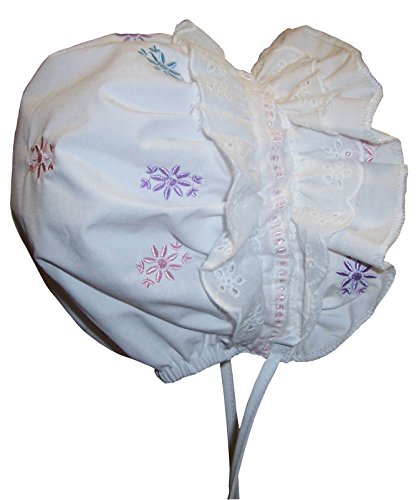 Binding : Apparel Product Description Sun Caps TM by Nice Caps baby girls puffy bonnet with eyelet gallon ruffled on crown. Elastic in back. Great summer fabric that is easy to wash, fully lined for added comfort for baby. Cute as can be. Color: white/pink ribbon, white/multi color embroidered flowers, washed Denim/white eyelet. Sizes: One size fits XS (3-6 months,) one size fits Small (6-9 months,) one size fits 12-18 months (label says 12-24 months, we recommend it for 12-18 months.) Tested and approved as per CPSIA standards. Designed in the USA. 0