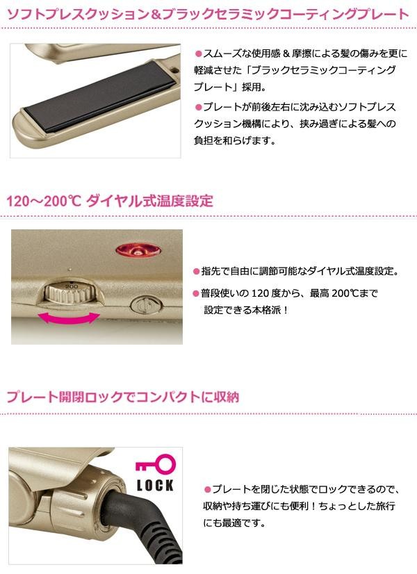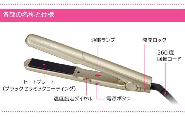 | 仕様 | 電源:AC100V 50/60Hz 消費電力:1~185W 温度設定:120度~200度 ヒーター:PTCヒーター ヒートプレート:ブラックセラミックコーティングプレート(幅22mm) 電源コード:1.7m(360度回転コード) 温度制御方式:ダイヤル調整式 自動電源OFF機能(30分) |