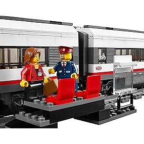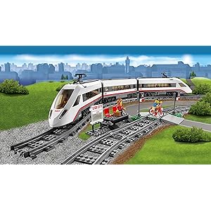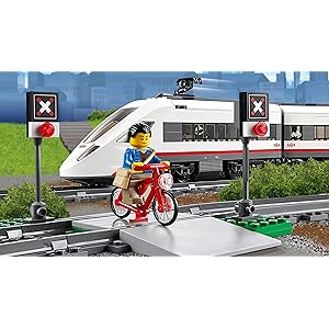 Travel around the city in no time with the motorized LEGO City High-speed Passenger Train! Operate the 8-channel, 7-speed infrared remote control to power around the curved tracks at top speed. This streamlined, super-efficient train has a high-speed front profile and electricity contact points on top. Lift off the roof of the front car to place the driver inside at the cool dashboard and open the passenger cars to access the seats and tables. Wait for the train with the traveler at the way station, and pedal safely across the crossing with the cyclist once the train has gone past. Includes 3 minifigures: train driver, traveler and a cyclist.