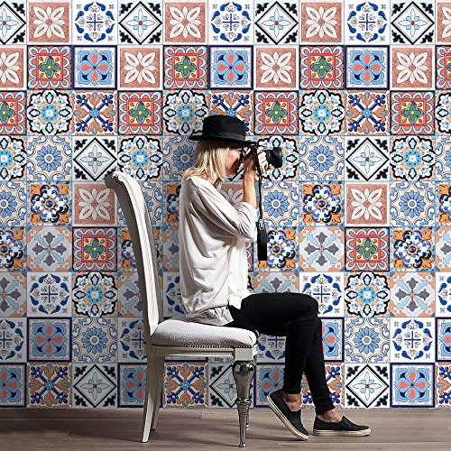H4S Mexican Talavera 7.8 Inches by 16.4 Feet Removable Peel and Stick PVC Wall Flooring Covering Decorative Backsplash Tile Stickers Decals Wall Paper for Bathroom Kitchen Art Home Decor, Pattern 3