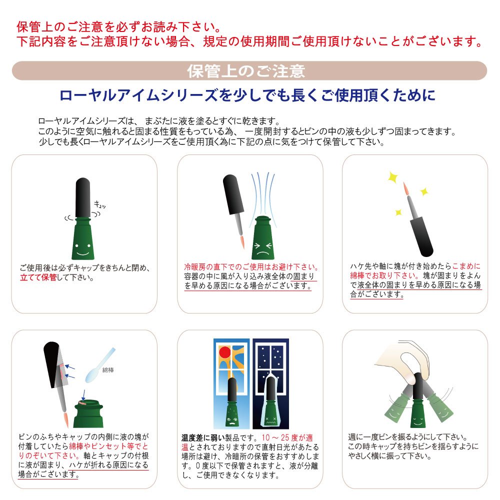 ローヤルアイム:ゴムラテックス、(スチレン/アクリル酸アルキル)コポリマーアンモニウム、 水、PG、アンモニア水、エタノールアミン、グリチルリチン酸アンモニウム、PVP、メチルパラベン、プロピルパラベン、褐201、赤213、クオタニウム-73 / リムーバー:水、テトラオレイン酸ソルベス-60、カルボマー、PG、BG、アロエベラエキス-1、ボタンエキス、アルテア根エキス、フユボダイジュ花エキス、アルニカエキス、水酸化K、メチルパレベン、プロピルパラベン、クオタニウム-73