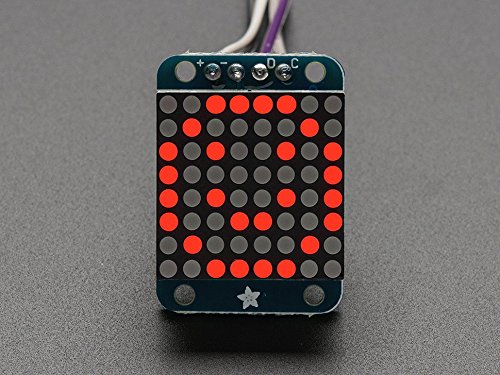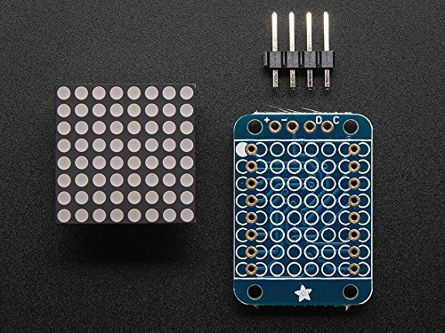 What's better than a single LED? Lots of LEDs! A fun way to make a small display is to use an 8x8 matrix or a 4-digit 7-segment display. Matrices like these are 'multiplexed' - so to control 64 LEDs you need 16 pins. That's a lot of pins, and there are driver chips like the MAX7219 that can control a matrix for you but there's a lot of wiring to set up and they take up a ton of space. Here at Adafruit we feel your pain! After all, wouldn't it be awesome if you could control a matrix without tons of wiring? That's where these adorable LED matrix backpacks come in. We have them in two flavors - a mini 8x8 and a 4-digit 0.56" 7-segment. They work perfectly with the matrices we stock in the Adafruit shop and make adding a bright little display trivial.The matrices use a driver chip that does all the heavy lifting for you: They have a built in clock so they multiplex the display. They use constant-current drivers for ultra-bright, consistent color (the images above are photographed at the dimmest setting to avoid overloading our camera!), 1/16 step display dimming, all via a simple I2C interface. The backpacks come with address-selection jumpers so you can connect up to four mini 8x8's or eight 7-segments (or a combination, such as four mini 8x8's and four 7-segments, etc) on a single I2C bus.