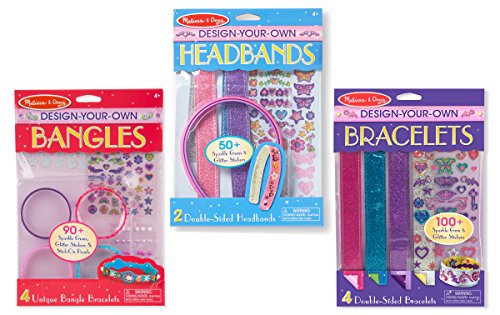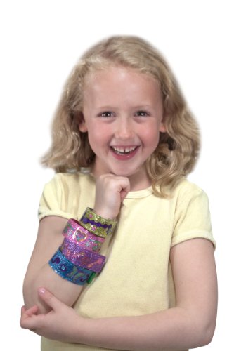 This exciting fashion activity set and bracelet craft kit lets kids make their own accessories to wear and share! The set includes four two-sided kids' bracelets, with a different shimmering color on each side. Just add the included sparkle-gem and glitter stickers to fill each one with flowers, hearts, butterflies, stars, loops, and swirls. Make your own bracelets, then close the reusable tab closure to wear your favorite--or layer a bunch for a sparkling fashion statement!Feature