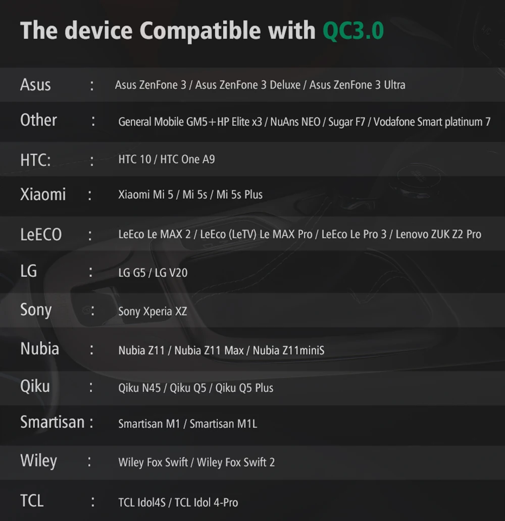 Support Quick Charge Technology:Qualcomm Quick Charge 2.0,Qualcomm Quick Charge 3.0