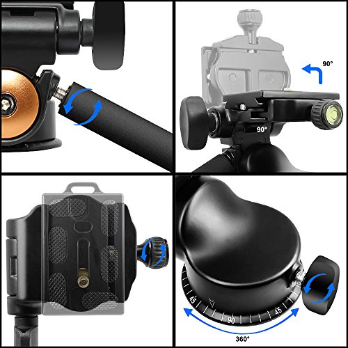 SIMPLE OPERATION: Single Handle design, Adjust or fix the three-dimensional head by loosening or tightening the handles.360 degree dial for level, clear and precise, realizing panorama shooting.