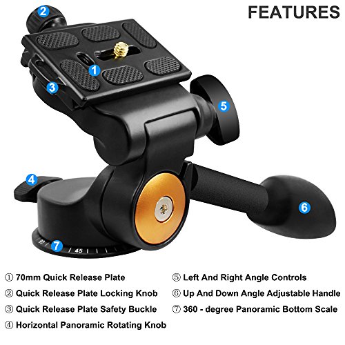 360 DEGREE ROTATION ANGLE: Quick release plate support 360 degrees horizontally moving and 180 degrees vertically moving can be fitted with a large VCR and a telephoto lens.