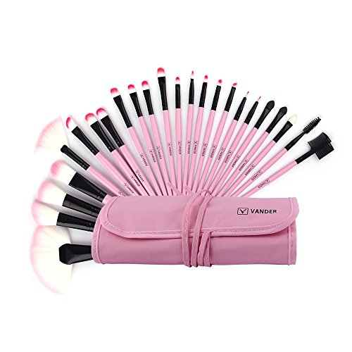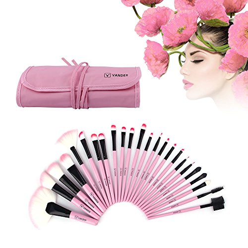 VANDER Pink 24pcs Professional Wool Cosmetic Eyeliner Foundation Eyebrow Shadow Blush Face Powder Makeup Brush Set Kit Brushes Tools Make Up Case