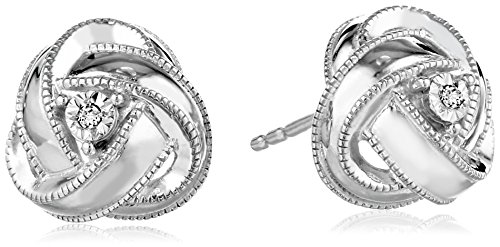Sterling silver knot earrings featuring textured trim and small diamond centers