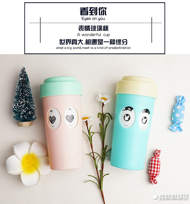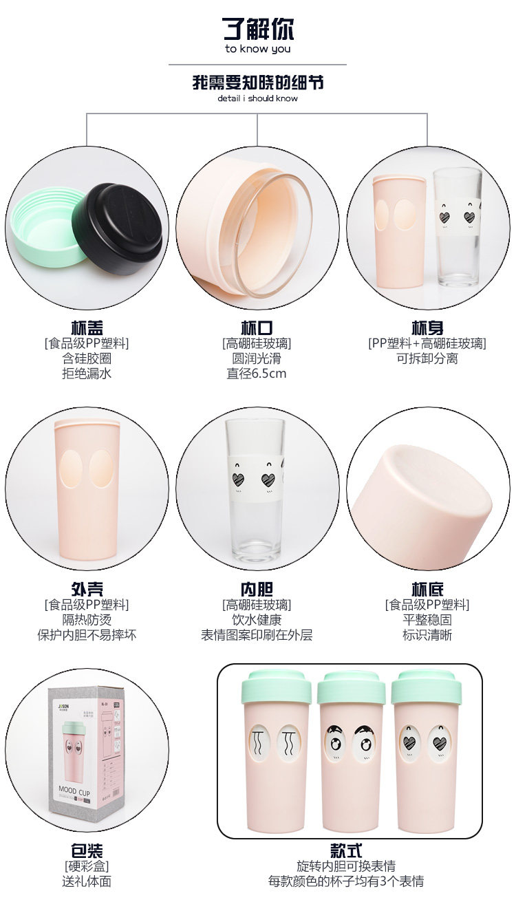 非常有爱的一款表情玻璃杯,每款颜色均有3个表情,旋转一下内胆就可以换,分别是萌萌哒的呆萌表情、可怜的哭泣表情、心花路放的喜爱表情,今天亲是什么心情呢?