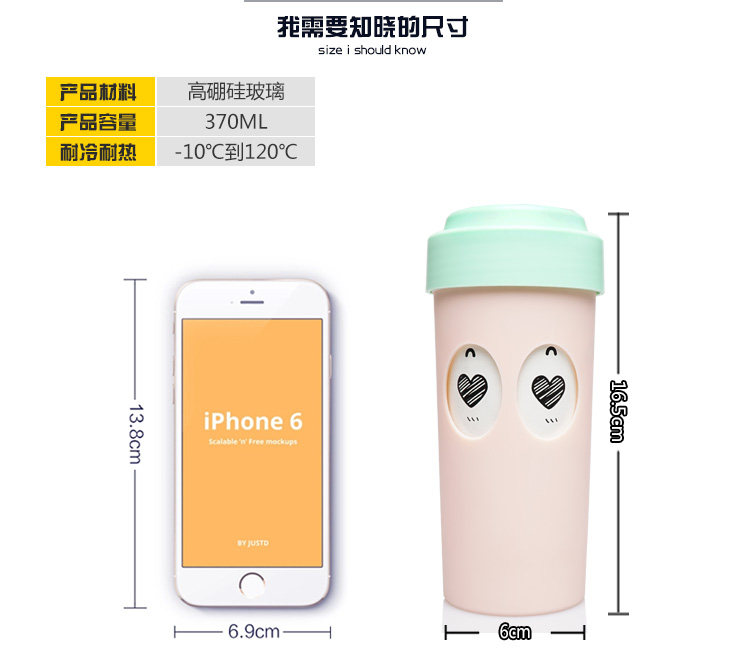 杯子容量: 370ml,杯身高度:16.5cm,杯身直径:6cm,杯口直径:6.5cm。耐冷耐热-10℃到120℃。