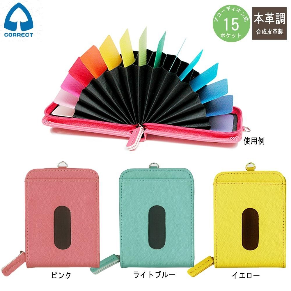 タテ型のホルダーは開くとクジャクの尾のように180度開くので、中身を探すのも取り出すのもラクラク。厚みに応じて伸縮自在なアコーディオン式の15ポケットにカードなどを多数収納可能です。ファスナー付き♪ |