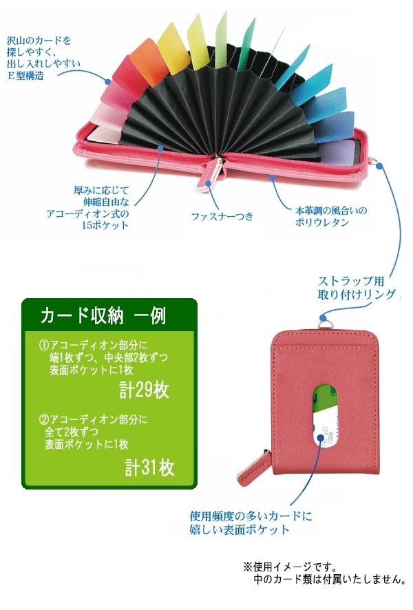 | タテ型のホルダーは開くとクジャクの尾のように180度開くので、中身を探すのも取り出すのもラクラク。厚みに応じて伸縮自在なアコーディオン式の15ポケットにカードなどを多数収納可能です。ファスナー付き♪ |