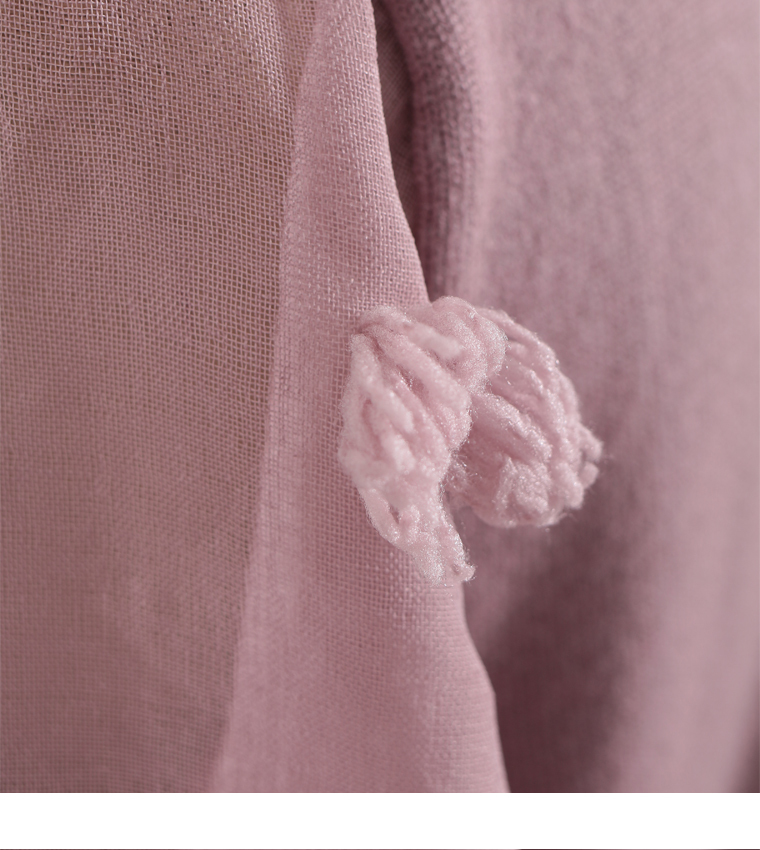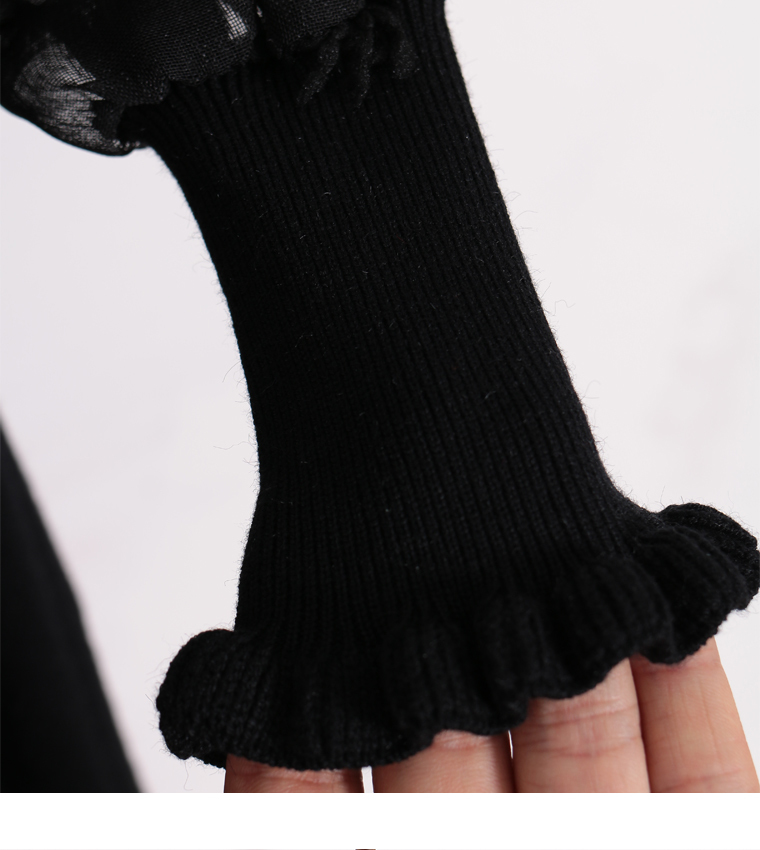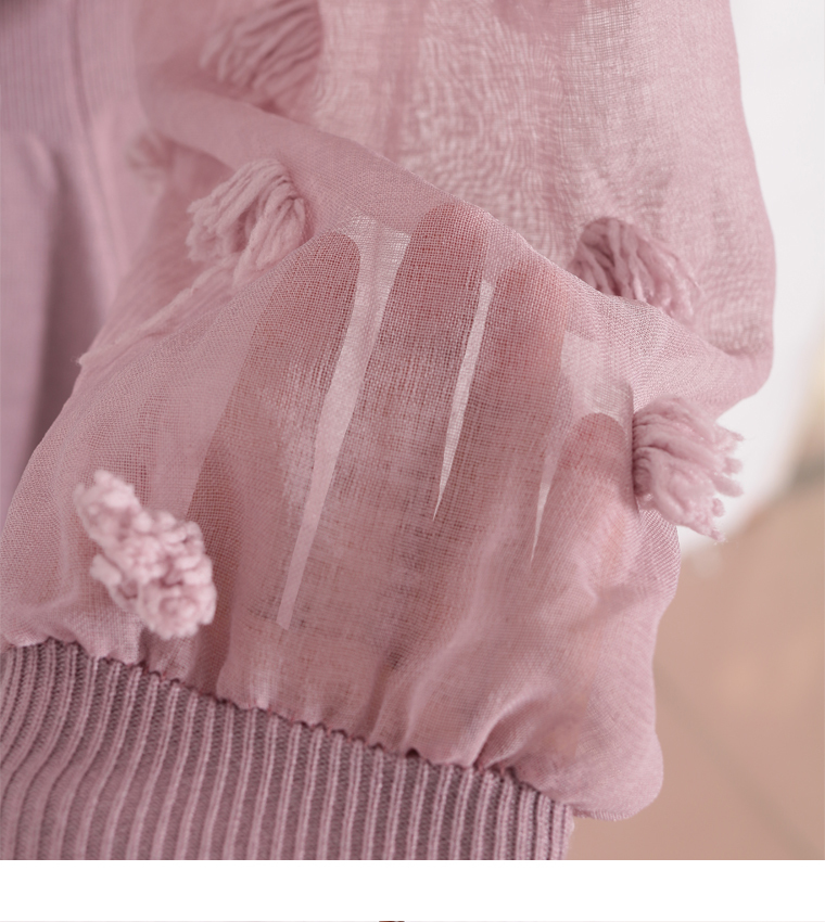 袖はトレンドのドット調ポンポン付きで透け感がオシャレ、袖口はリブニットになっていて色んな表情が楽しめます。