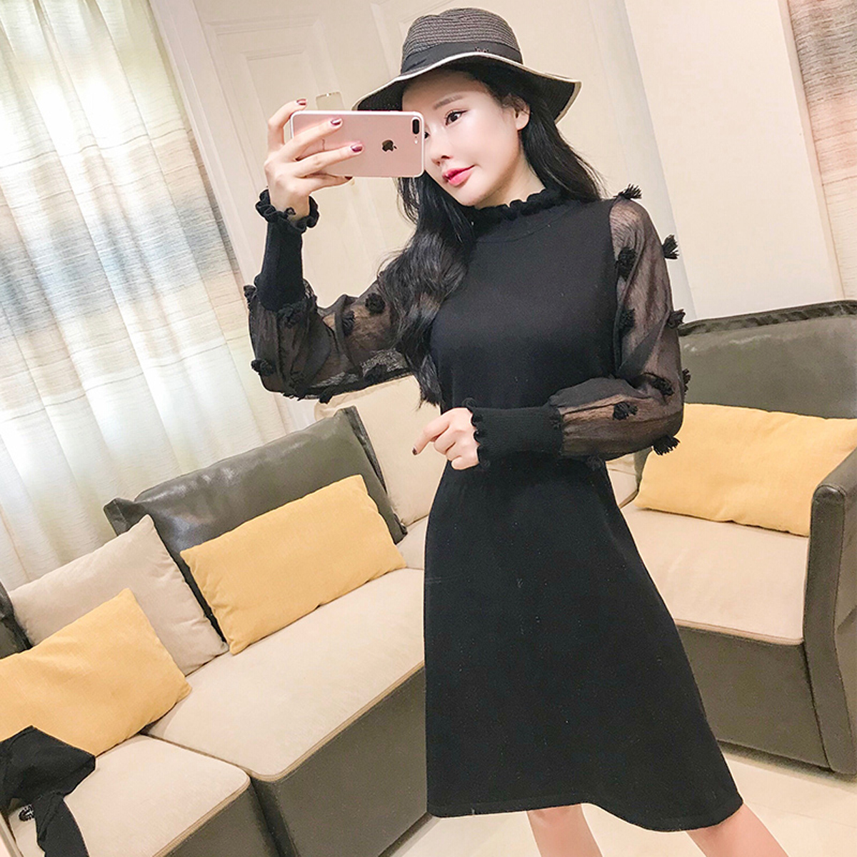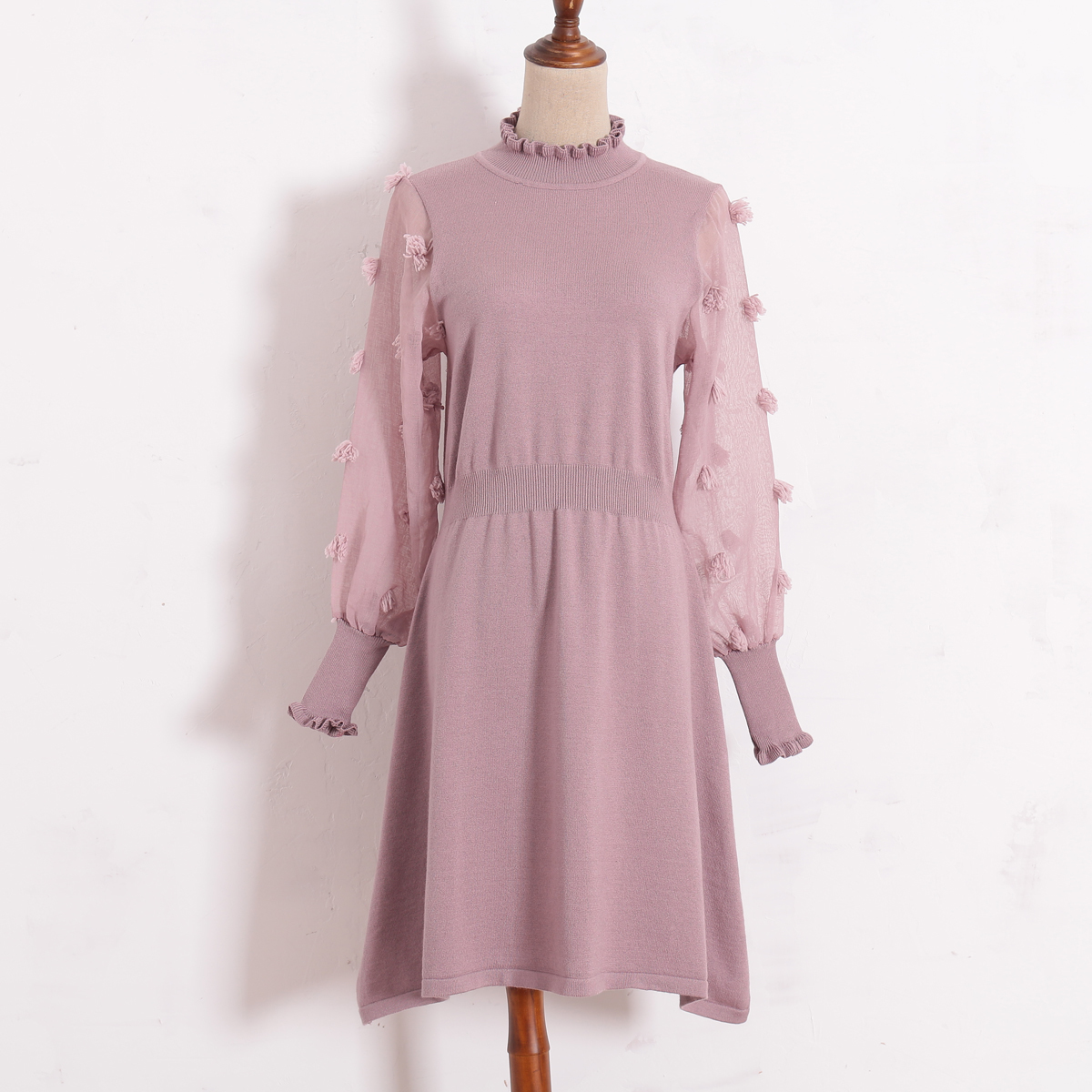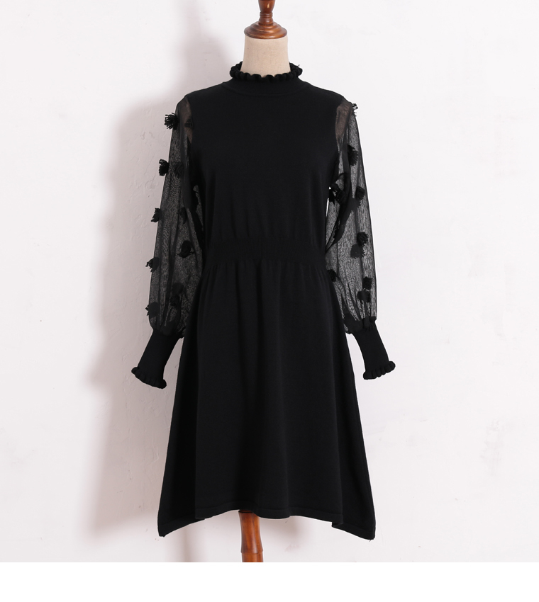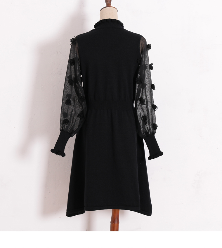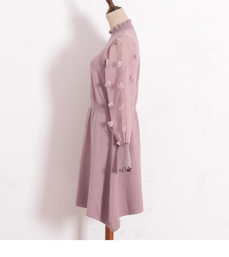 異素材MIX ハイネック ドット柄 透け感 リブニット袖 ワンピース 秋