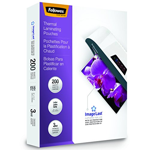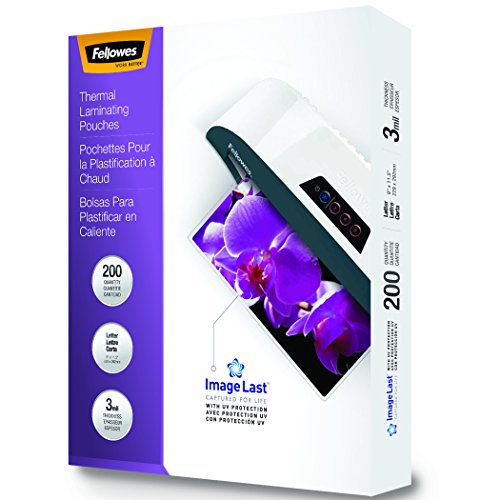 Fellowes ImageLast laminating pouches with built in UV protection prevent fading and provide superior laminate. Premium materials ensure excellent clarity and durable results. Directional arrow guidance ensures correct pouch insertion into laminator. Compatible with all laminator brands.