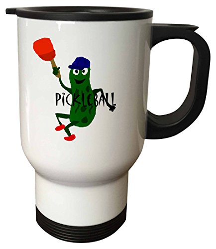 3dRose tm_216357_1 Funny Pickleball Pickle with Blue Hat and Paddle Travel Mug, 14 oz, White