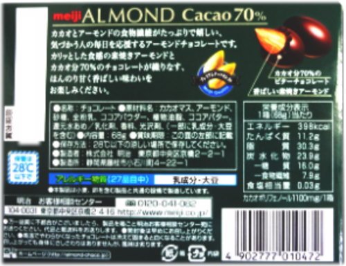 カカオ分70%のチョコレートで素焼きアーモンドを包んだ、アーモンドチョコレートです。1箱あたり、食物繊維をたっぷり7.9g含んでいます。カリッと香ばしい素焼きアーモンドと、ほんのり甘く食べやすいチョコレートとの組み合わせです。明治は、赤ちゃんからお年寄りまで、いろいろなシーンでいつもあなたのそばにありたい。おいしさであなたとずっとつながっていたい。昨日より今日、今日よりも明日。あなたの明日をもっとおいしくするために。