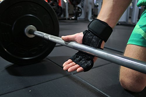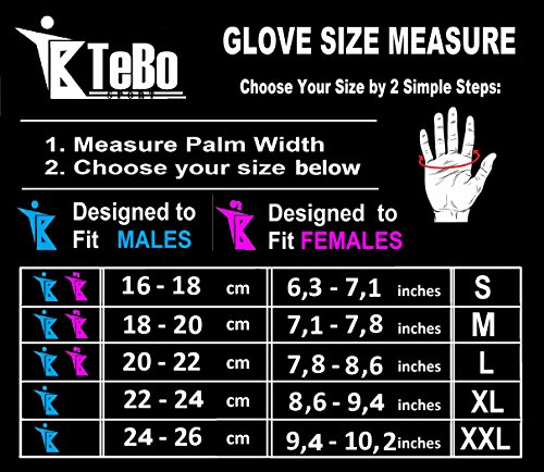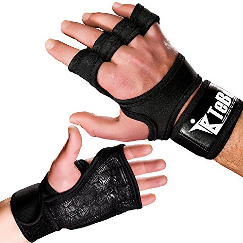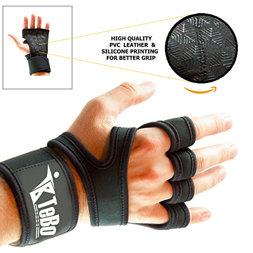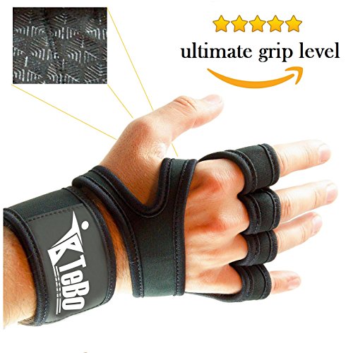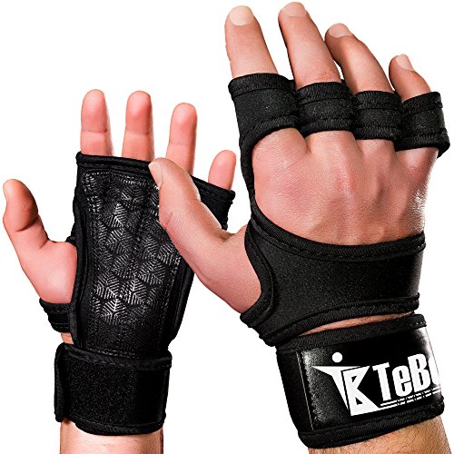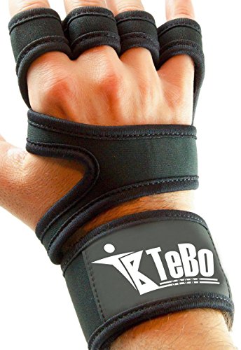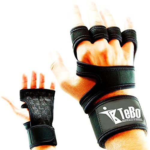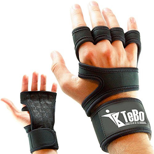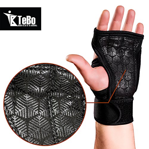 Binding : Misc. Product Description TeBoSport Training Gloves with Wrist Wraps - Dependably Strong Gym Gloves for Men Women Looking for some wrist support exercise gloves you can count on when exercising at the Crossfit gym? Searching for the perfect unisex non-slip black weightlifting gloves to maximize your gripping power? Improve Gripping: Most gym accidents injuries are caused by those not using proper lifting equipment, which is why we have designed a pair of protective fitness gloves with wrist support that does it all with ease. Wick Away Sweat: Unlike other weight training gloves, these max sport gym gloves have been engineered to also wick away sweat moisture from your palms knuckles to keep them dry while you exercise. Protect the Palms: The training gloves don't stop there. Generously padded with silicone foam, our fingerless fitness gloves also provide adequate protection against painful blisters, finger callouses friction sores. For Men Women: Our knuckles out weightlifting gloves don't discriminate. Developed to feature adjustable wrist wraps available in adult sizes, these gym gloves fit both men women athletes gym-goers. Suggested Uses: Though commonly used as bodybuilding gym gloves or padded lifting gloves, these wrist support fitness gloves can also be used for other purposes. Use the exercise gloves with grips to do pull ups, chin ups WODs or to lift, pull or jump dumbbells, kettlebells, chest bars other weightlifting gym gear. No Crossfit guru, bodybuilder, weightlifter or personal trainer should ever be without a pair of half hand training gloves! 5 Adult Glove Sizes Available: Small, Medium, Large, XL XXL (Each pair of heavy duty gym gloves is equipped with adjustable straps) Never again hit the gym unprepared. Get yourself the finest fitness gear. Click 'ADD TO CART' to order your wrist wrap gym gloves today! 0
