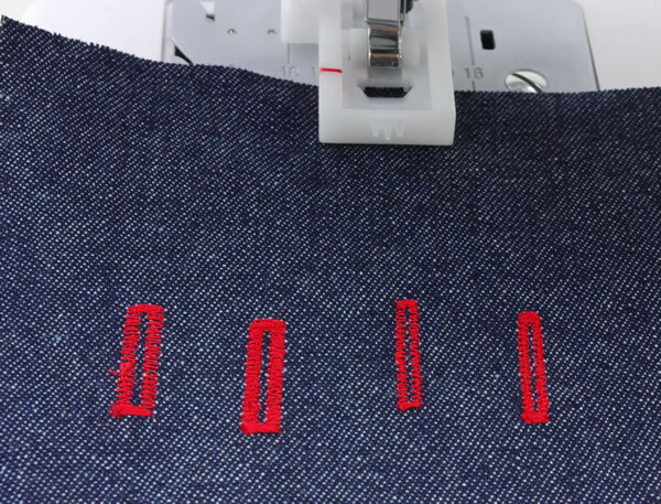 ボタンホールも2種類有り、通常使う場合は、標準(縫い模様下段右から2番目)、ブラウスの袖は薄い素材の場合は小幅(縫い模様下段右)で使い分けできます。