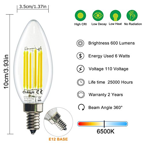 LED Candelabra Bulbs 6W 6500K White E12 Base Non Dimmable Filament Chandelier Light Bulbs 60W Equivalent, 600LM For Home, Kitchen, Dining Room, Bedroom, Living Room, Daylight White, 6-Pack