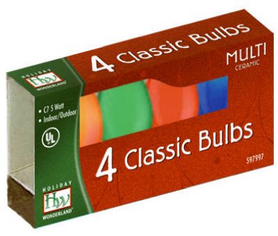 Studio : COLEMAN CABLE INC Publisher : COLEMAN CABLE INC Binding : Tools Home Improvement Product Description Extend the life of holiday lights with the holiday Wonderland ceramic candelabra base replacement bulbs. Features a C7, 120V construction and multi-colored bulbs. PROVIDES easy, hassle-free installation and long lasting use.Product is available in a 4 pack. 0