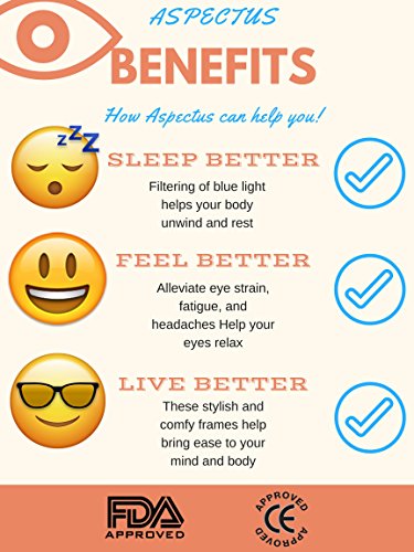 Studio : Organomical Publisher : Organomical Binding : Health and Beauty Product Description Do you have trouble sleeping? Scientists have found that exposure to artificial blue light from phones, computer, tablets, TVs and room lighting suppresses melatonin, a hormone essential to preparing the body for sleep. ? A Harvard University study concluded that people who used electronic devices at night: → Took longer to fall asleep → Had decreased quality of sleep (waking up feeling not refreshed) → Had reduced REM sleep (portion of sleep where your body begins healing and restoring itself) → Participants took longer to wake up, and felt tired and lethargic upon arising. Suffer from tired eyes? Headaches? Research shows that too much exposure to blue light could lead to: ? Digital Eye Strain - Symptoms of eyestrain include fatigue, dry eyes, sore or irritated eyes and difficulty focusing. ? Retina Damage - Studies suggest that continued exposure to blue light over time could lead to damaged retinal cells. This can cause vision problems like age-related macular degeneration. Aspectus is Here to Help! In addition to regulating your circadian rhythm, Aspectus protects your eyes from harmful blue light, promoting relaxation of the body and mind. ? In 2009, research published in Chronobiology International found dramatic improvements in insomnia and mood in about half of bipolar patients who wore blue-blocking glasses. ? Research also stated that those who wore blue-light blocking glasses for 3 hours before sleep found that both sleep quality and mood improved. Aspectus is perfect for Office Use, Gamers, or anyone using electronic devices for prolonged periods. Improve your health, Improve your life, Choose Aspectus! 0