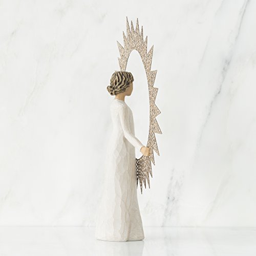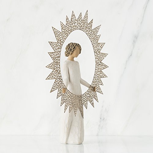 With this Starlight Willow Tree Angel Tree Topper, Artist Susan Lordi presents a heavenly messenger with a warm gift of celestial light and radiance from the sun. Sitting atop your Christmas tree or greeting guests from the mantel, this solitary angel with wavy brunette locks pinned at the nape, is framed by a cosmic halo. The pierced metal sun star features glitter that catches the light at every angle. Capturing the sun as an expansive star, this angelic tree topper melds tradition with new silhouettes and faithful symbols of the season. In crafting this piece, Lordi considered the Christmas tree topper tradition of the angel and the star. Inspired by the meaning of the season, Lordi designed a sun-shaped star, channeling the universal nature of the sun and all of its gifts. Dimensions 12"HFeature