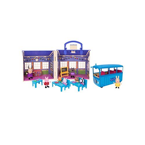 -. Feature : Peppa Pig Peppa's Back To School Playset / Includes: School house, School bus, 8 character figures, 3 desks, Easel, and Bookcase / School House folds. Removable roof for easy access. / Interactive design features cool sound effects / Measures: 11"H x 27"W x 10"D