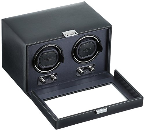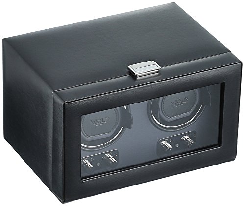 Studio : Wolf Designs Inc Publisher : Wolf Designs Inc Binding : Kitchen Product Description The WOLF Heritage Double Watch Winder will restore power to your automatic watches while also providing them with a brilliant vehicle for display in your office. The Heritage Winder features a black pebbled faux leather exterior with a locking glass clover secured at the top by a latch. The grosgrain-lined interior is accented with chrome-finished hardware that includes easy-to-use controls for customizing direction, rotation, and more. Both side-by-side recessed winders are paired with locking cushions compatible with nearly all watch sizes. Additional Features Rotates 900 turns per day 10-second start delay Intermittent rotation with pre-programmed pause and sleep phases Optional 12-hour delay setting Clockwise, counterclockwise, and bi-directional settings Bi-directional doubles the number of turns per day Cuff fits bigger, heavier watches -- up to a 52mm case Locks cuff securely into rotator drum Includes universal AC power adapter Dimensions: 10.25W x 7.5D x 6.25H in.. 2 winder modules. Black faux leather and grosgrain. Glass cover with latch closure. Chrome-finished hardware. 0