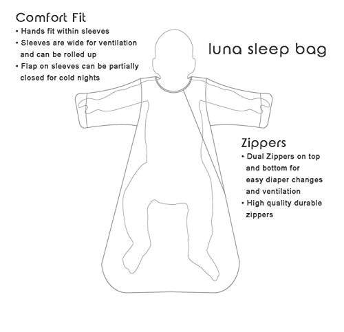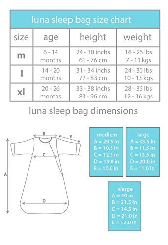 The Jasper Baby Luna Sleep Sack has attachable sleeves to be versatile in each nursery environment. The sleep bag is a wearable blanket that replaces your child's loose blankets. - Attachable sleeves allow for all year use for nursery temperatures from 60-72F (15-22C) - Dual zipper allows easy top and bottom access for night diaper changes or feet ventilation. - Zipper guard on top zipper for maximum comfort. TOG: 2.5 - Machine washable tumble dry - see care instruction on tag. - Meets all US government CSPC requirements. Made with 100% cotton shell and liners. 100% Polyester fill. SIZING: Since children vary in size for the same age please make sure your child's height falls into the range for the selected size. Large fits height 25-32 inches / 22-28 lbs / 12-18 months. XLarge fits height 32-38 inches / 18-24 months / 25-35 lbs.Feature