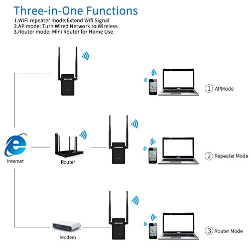 Wifi Repeater Mode -- extend wifi signal, AP Mode -- turn wired network to wireless, Router Mode -- Mini router for home use