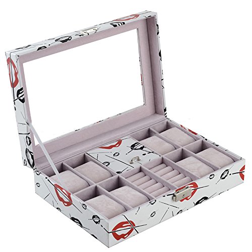 -. Feature : • Material: Surface PU Leather/Velvet Lining/Glass Top/Hardware Lock &Key / • Color: White Special Pattern Design / • Size: 30cm*20.2cm*8cm/11.81" L*7.95" W*3.15" H, Weight: 1155g/2.55Lbs / • Display: 8 grids for watch + 10 grids for ring + 1 large box with cover for bracelets and necklaces / • Well packaged. Enough stock in US warehouse, free shipping, duty free.