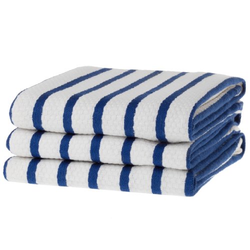 KAF Home Basket Weave Kitchen Towels, White with Royal Blue Stripes, Set of 3, 100% Cotton, Over-sized & Super Absorbent
