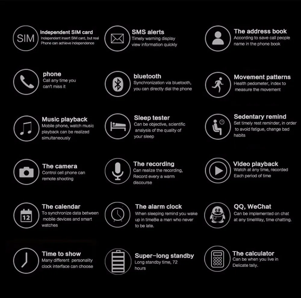 Function:Dial Call,24 hour instruction,Answer Call,Passometer,Fitness Tracker,Remote Control,Push Message,Message Reminder,Alarm Clock,World Time,Call Reminder,Calendar,Sleep Tracker
