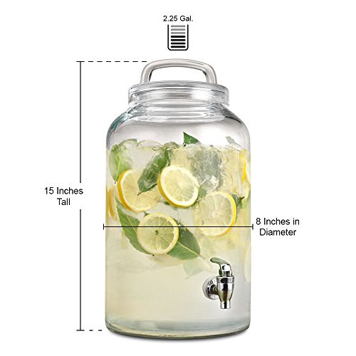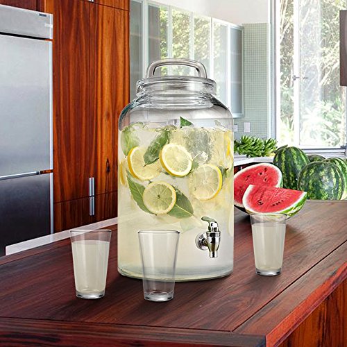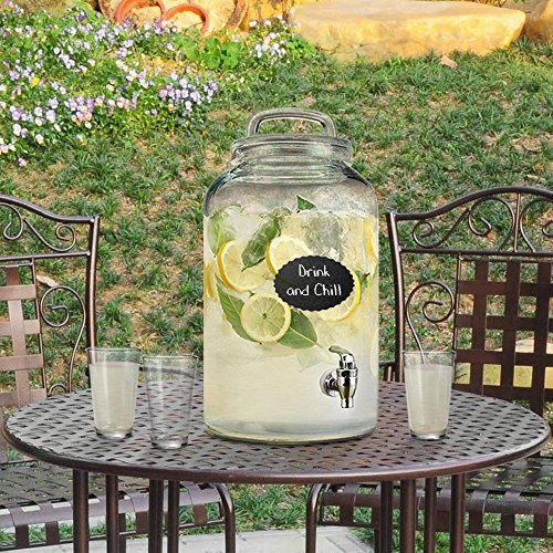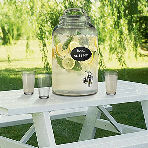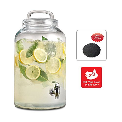Studio : Emenest Publisher : Emenest Product Description Upscale beverage design by Emenest. This extra-large wide mouth dispenser is suited for filling the gallon jar with sliced fruits and ice, and can accommodate large events with a one-time fill thus saving you from transport. Crafted out of clear thick glass, it will never get damaged and it will always look as good as new! A deep jug that suits many tastes and decors, it accentuates kitchen islands, party buffets, and sweet tables with striking height. Its stylish airtight cover tops it off making outdoor use of this product possible. It keeps your beverage cool while enjoying the summer breeze or cookouts. Our water dispenser with acrylic leak proof and non-drip spigot makes serving easy and mess free. Customize the chalk label with fun quotes or name your drinks for guests. Just wet wipe for new messages.