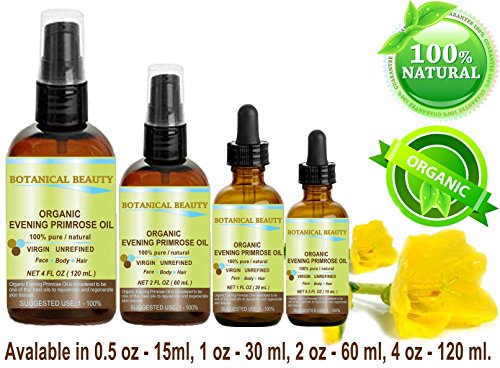 -. Binding : Misc. -. Brand : Botanical Beauty -. EAN : 0799975500591 -. Feature : ORGANIC EVENING PRIMROSE Oil contains a high concentration of a fatty acid called GLA . The gamma-linoleic acid, linoleic acid and other nutrients in this oil are essential for cell structure and improve the elasticity of the skin. / ORGANIC EVENING PRIMROSE Oil for dry/flaky/ chapped/ cracked, sensitive and mature skin types. Effectively moisturize, reduces wrinkles, dryness, encourages regeneration of skin cells and keeps skin soft. / ORGANIC EVENING PRIMROSE Oil helps damaged skin like ACNE, PSORIASIS, ECZEMA, ROSACEA, STRETCH MARKS, SCARS, and ACNE. / ORGANIC EVENING PRIMROSE Oil helps for dry, damaged hair and dry scalp. It also soothes inflammation and can be used in dandruff applications. / ORGANIC EVENING PRIMROSE Oil is used in dilution with Botanical Beauty Grape seed Oil suitable for massage. Evening Primrose can be used for soap making and bath and body products. -. Label : Botanical Beauty -. Manufacturer : Botanical Beauty -. MPN : MG-HMXM-ODO0 -. PackageQuantity : 1 -. PartNumber : MG-HMXM-ODO0 -. ProductGroup : Beauty -. ProductTypeName : BEAUTY -. Publisher : Botanical Beauty -. Studio : Botanical Beauty -. Title : ORGANIC EVENING PRIMROSE OIL. 100% Pure / Natural / Undiluted / Unrefined /Certified Organic/ Cold Pressed Carrier Oil. Rich antioxidant to rejuvenate and moisturize the skin and hair. 0.5 Fl.oz.- 15 ml. by Botanical Beauty -. UPC : 701017593362